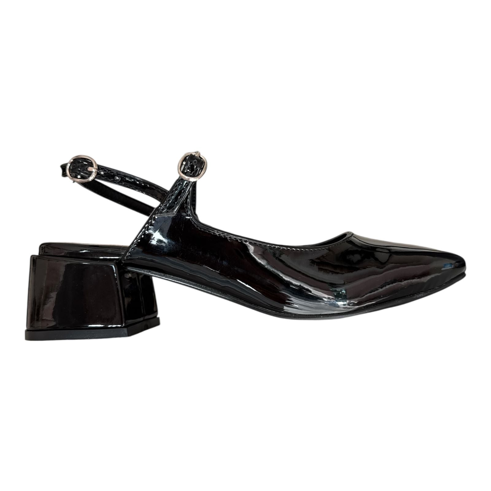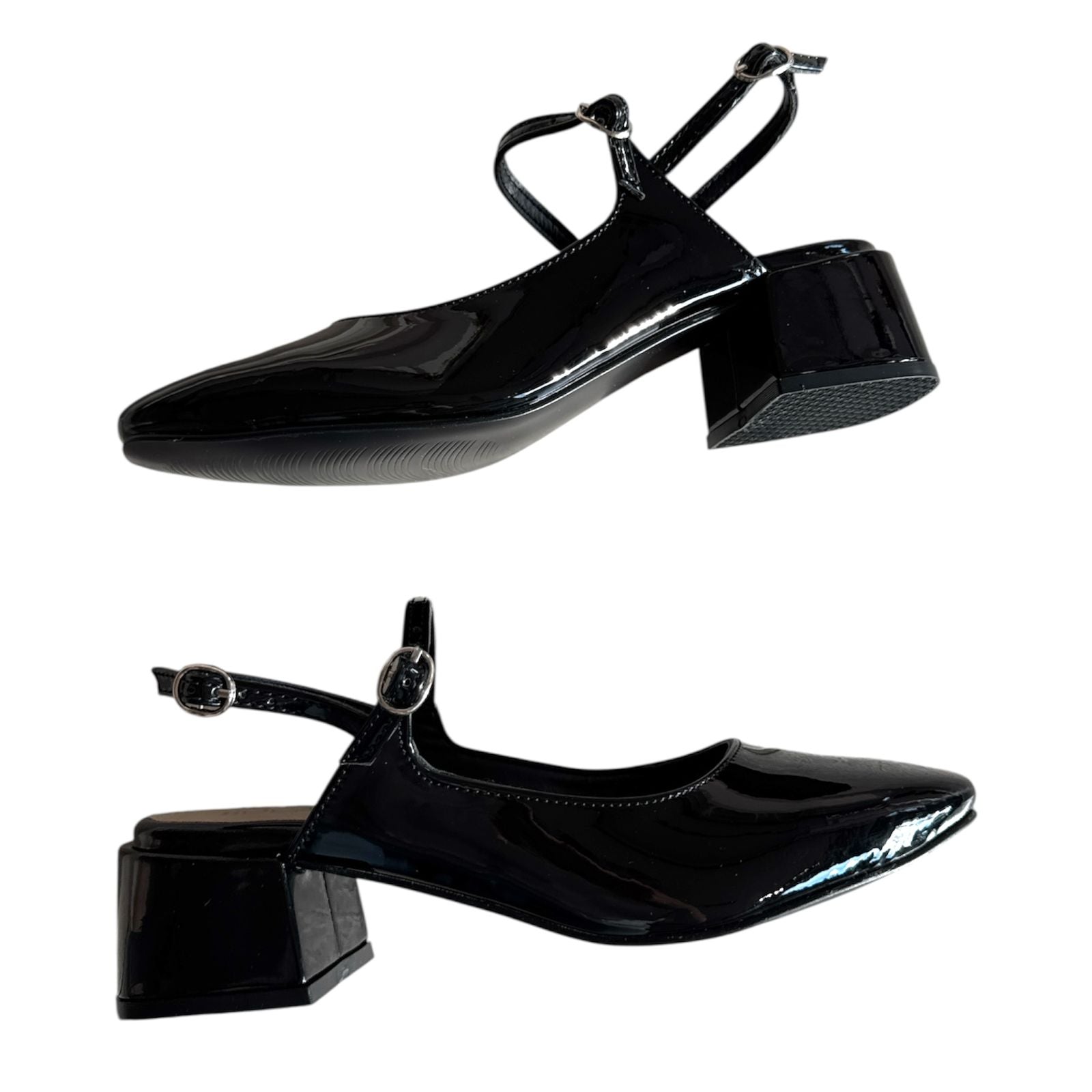 Este slingback de charol combina lo mejor del estilo vintage con la comodidad actual. Su diseño de punta cerrada, tacón geométrico y tiras ajustables lo hace ideal para usar en oficina, eventos o looks formales con un toque chic.