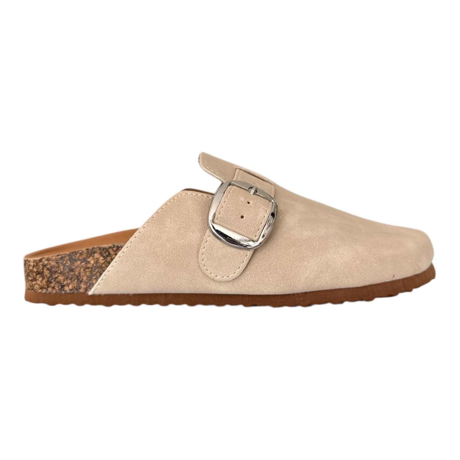 Su diseño tipo mule con hebilla metálica y plataforma de corcho lo convierten en el match perfecto entre estilo relajado + comodidad absoluta.