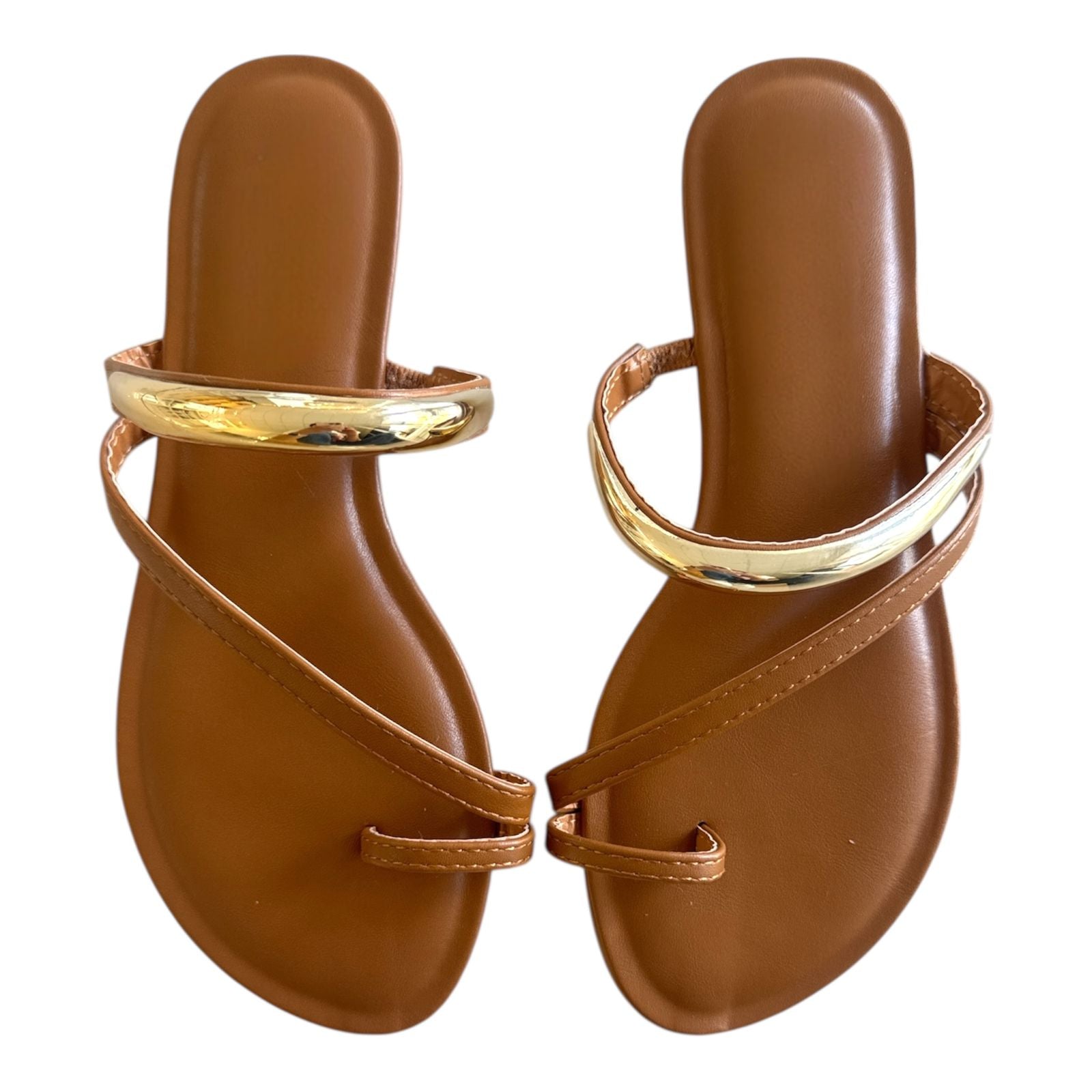 Minimalista pero con mucho estilo. Esta sandalia en tono camel con apliques dorados eleva cualquier look con su diseño moderno y elegante. La tira al dedo y el toque metálico le dan ese extra chic que no puede faltar en tu colección. ¡Perfectas para el día a día o una salida casual! ✨