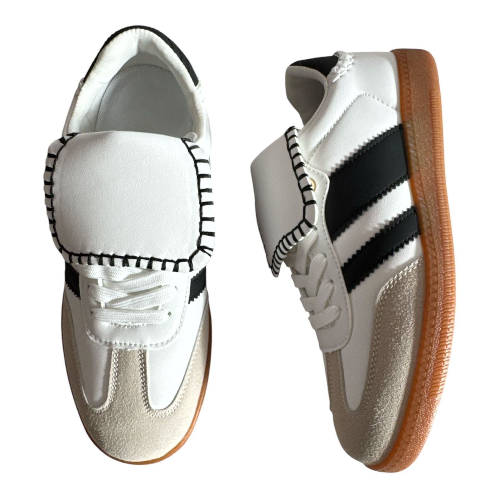 Estos sneakers combinan lo clásico del diseño deportivo con detalles únicos como la lengüeta XL con costuras decorativas. Su suela de goma y contraste en negro y beige los hace versátiles y súper cómodos para el día a día.
